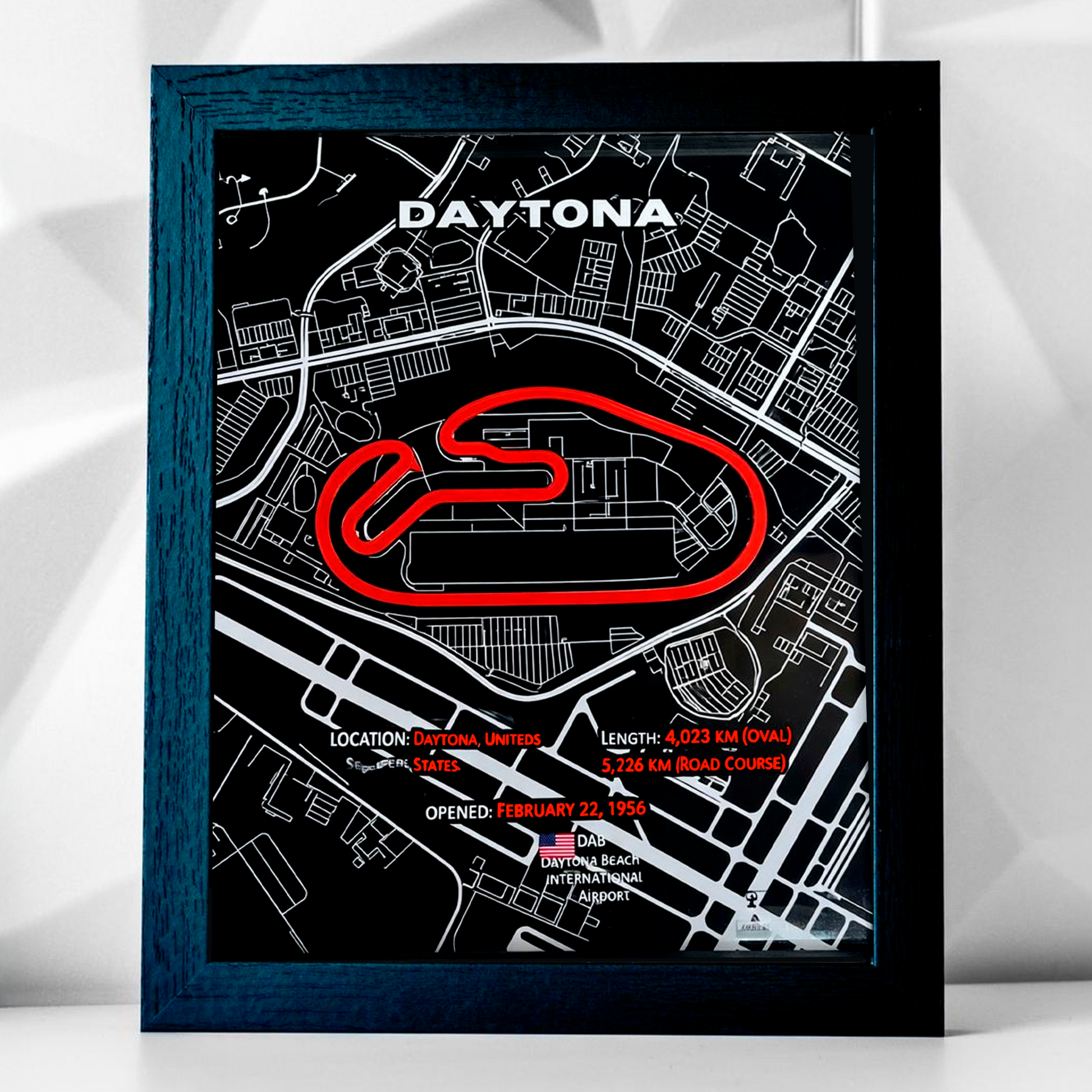 Este impresionante cuadro es una obra única, elaborada a mano con materiales de alta calidad para capturar la esencia de uno de los circuitos más legendarios del mundo: Daytona. Con una estructura base de madera que destaca por su acabado rústico y elegante, y detalles finos creados mediante impresión 3D, cada pieza refleja la precisión y complejidad del trazado de este circuito famoso.